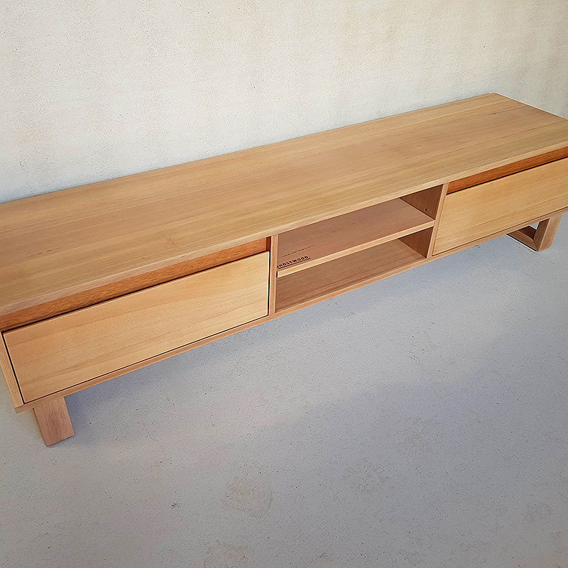 TV Unit featuring 2 soft close drawers with finger pull opening, adjustable height middle shelf with rear recess for appliance cords. This item is available for order, please contact us to customise it to fit your space.